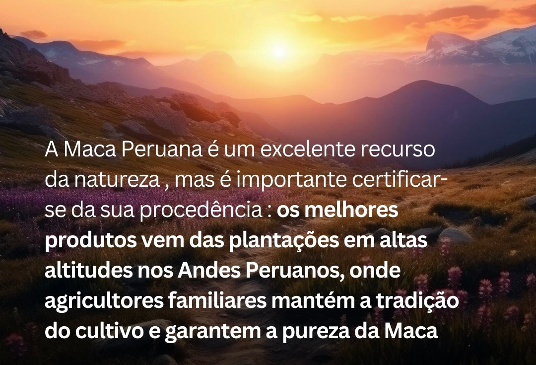 A Maca Peruana é um produto importado e cultivado em altas altitudes, e os melhores benefícios serão sentidos com os produtos cultivados em altas altitudes, nas regiões de maior tradição na região dos Andes do Peru.